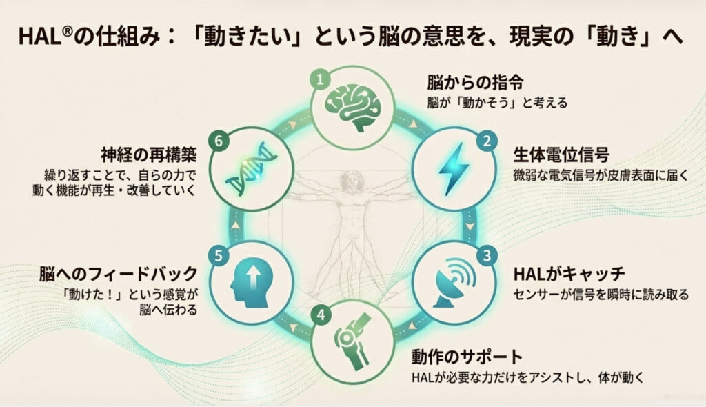 体を動かそうとする脳からの電気信号をHALが検出し、動作をサポートすることで、身体の機能を改善・再生します。